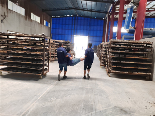 模擬1#推板窯車(chē)間,工作人員在窯爐(有限空間)內(nèi)檢修窯爐時(shí),燃?xì)獯嬖谛孤?,操作人員中毒的應(yīng)急處理。演練中,現(xiàn)場(chǎng)人員做好事故報(bào)告,掌握救援要點(diǎn),做好現(xiàn)場(chǎng)控制,疏散有關(guān)人員等,掌握了有限公司空間作業(yè)的應(yīng)急救援能力等。