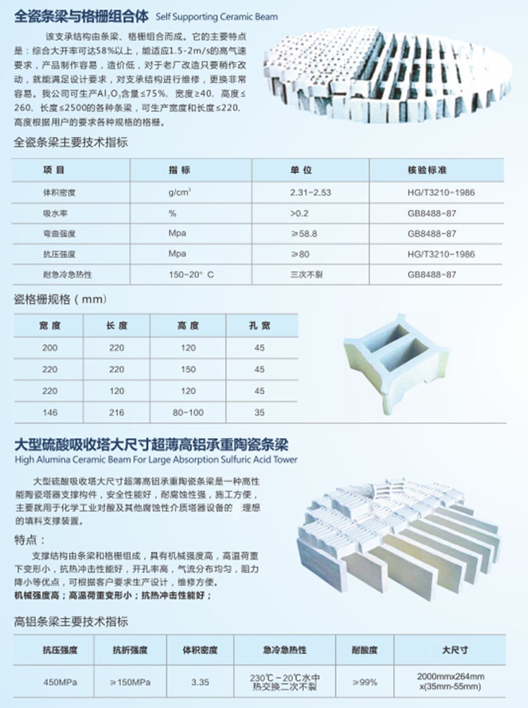 不僅如此,這種支撐結(jié)構(gòu)的設計是由格柵以及條梁共同組合而成的。這樣的設計使得其整體的綜合開孔率可達58%以上,能適應1.5-2m/s的高氣速要求,產(chǎn)品制作容易,對于老廠改造只要稍作改動,就能滿足設計要求,對支承結(jié)構(gòu)進行維修,更換非常容易。我公司可生產(chǎn)Al2O3,含量≤75%,寬度≥40,高度≤260,長度≤2500的各種條染,也可根據(jù)用戶要求,生產(chǎn)寬度和長度≤220的各種規(guī)格格柵。這種產(chǎn)品主要是用于化學領(lǐng)域以及硫酸制造等諸多產(chǎn)業(yè)的塔內(nèi)填料的結(jié)構(gòu)支撐。